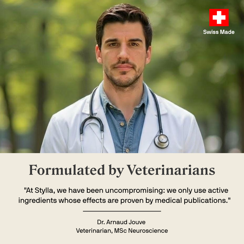 The best calming supplement for cats typically contains scientifically-backed active ingredients like L-Tryptophan and Alpha-casozepine. These natural ingredients work with your cat’s brain chemistry to reduce stress and anxiety without causing sedation. Stylla Calmness combines these proven ingredients in a Swiss-made formula that supports emotional balance. Unlike calming treats or calming chews, liquid supplements can be easily mixed into food, making administration simple even for cats in multi cat households. Many veterinarians recommend supplements with these active ingredients as they provide anxiety relief while maintaining your cat’s natural behavior.